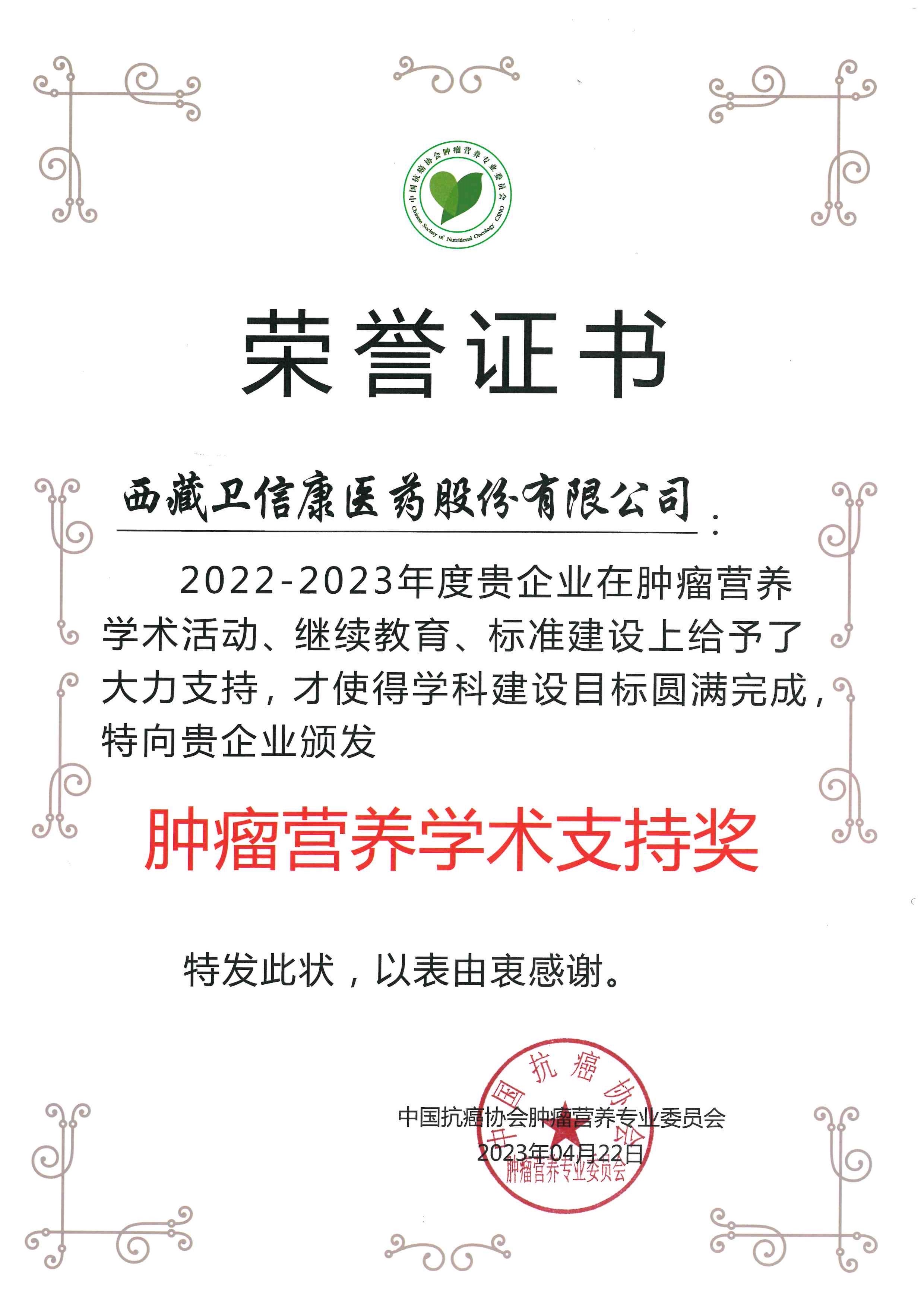 大會頒獎環(huán)節(jié),衛(wèi)信康醫(yī)藥再次獲得了腫瘤營養(yǎng)學(xué)術(shù)支持獎這一榮譽。未來,衛(wèi)信康醫(yī)藥也將繼續(xù)砥礪前行,在營養(yǎng)治療領(lǐng)域貢獻自己的力量。